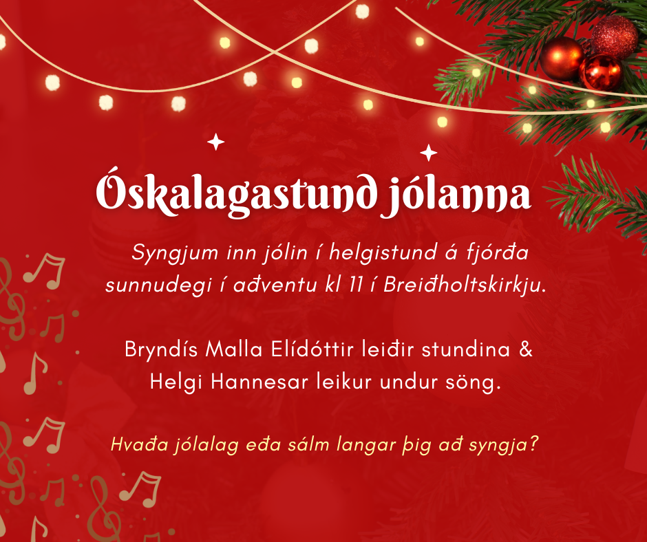 Í Breiðholtskirkju verður hins vegar sameiginleg helgistund fyrir báðar kirkjur sem nefnist óskalagastund jólanna. Þar ætlum við að syngja inn jólin kl 11:00. Sr. Bryndís Malla Elídóttir prófastur leiðir stundina og Helgi Hannesar leikur undir söng. Hvaða jólalag eða sálm langar þig að syngja?