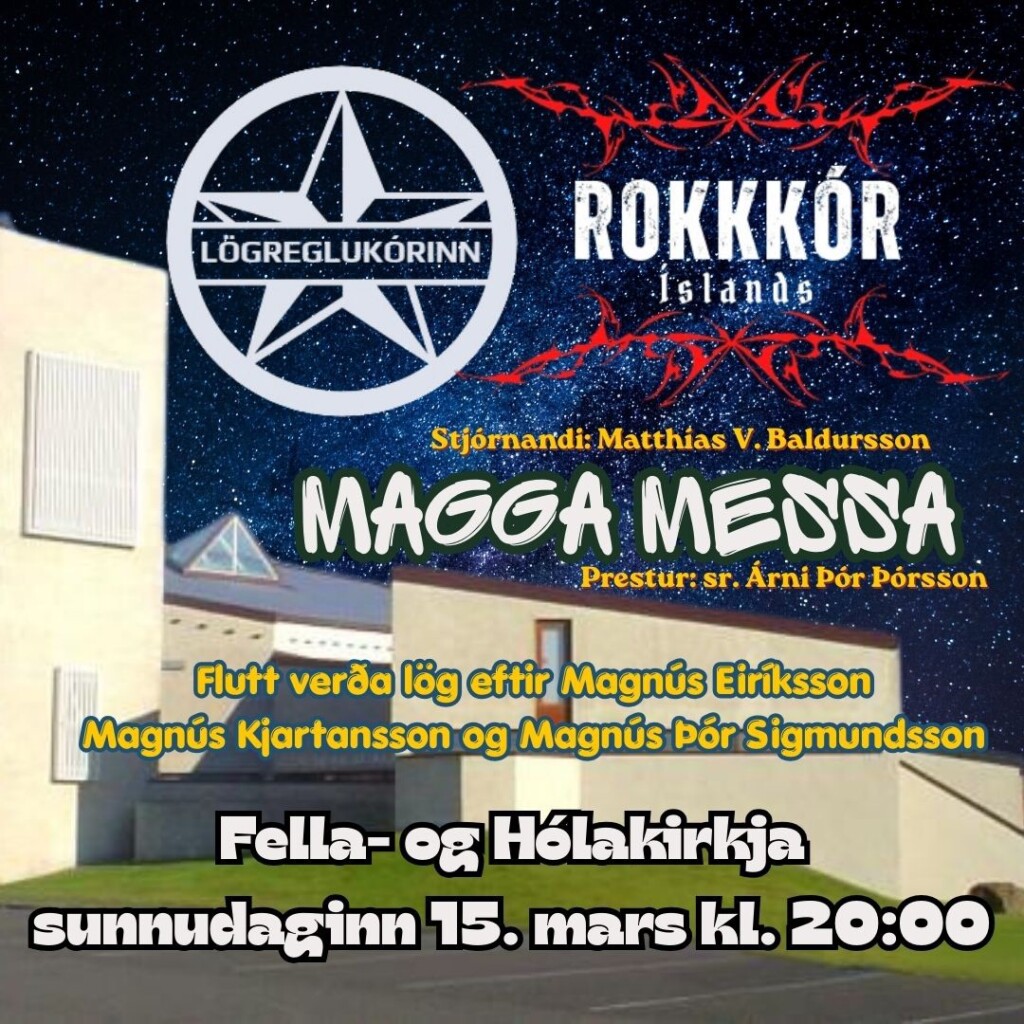 Lögreglukórinn og Rokkkór Íslands syngja lög eftir þá Magnús Eiríksson, Magnús Kjartansson og Magnús Þór Sigmundsson og má því segja að um ,,Magga messu“ sé að ræða. Stjórnandi er Matthías V. Baldursson og prestur er sr. Árni Þór Þórsson.